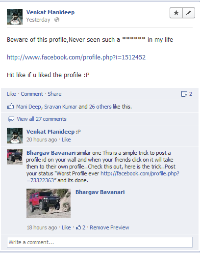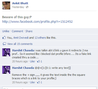 Whoever clicks on those links they will be directed to their own profiles(i.e., profile of whoever clicks it).Many people were surprised at the first moment thinking that i have posted about them and started posting comments on my profile saying "whats dis?", " why did u do dis?" etc.Many scolded me on my inbox :P but the thing happening behind is something different.Now let us see whats the small trick behind that